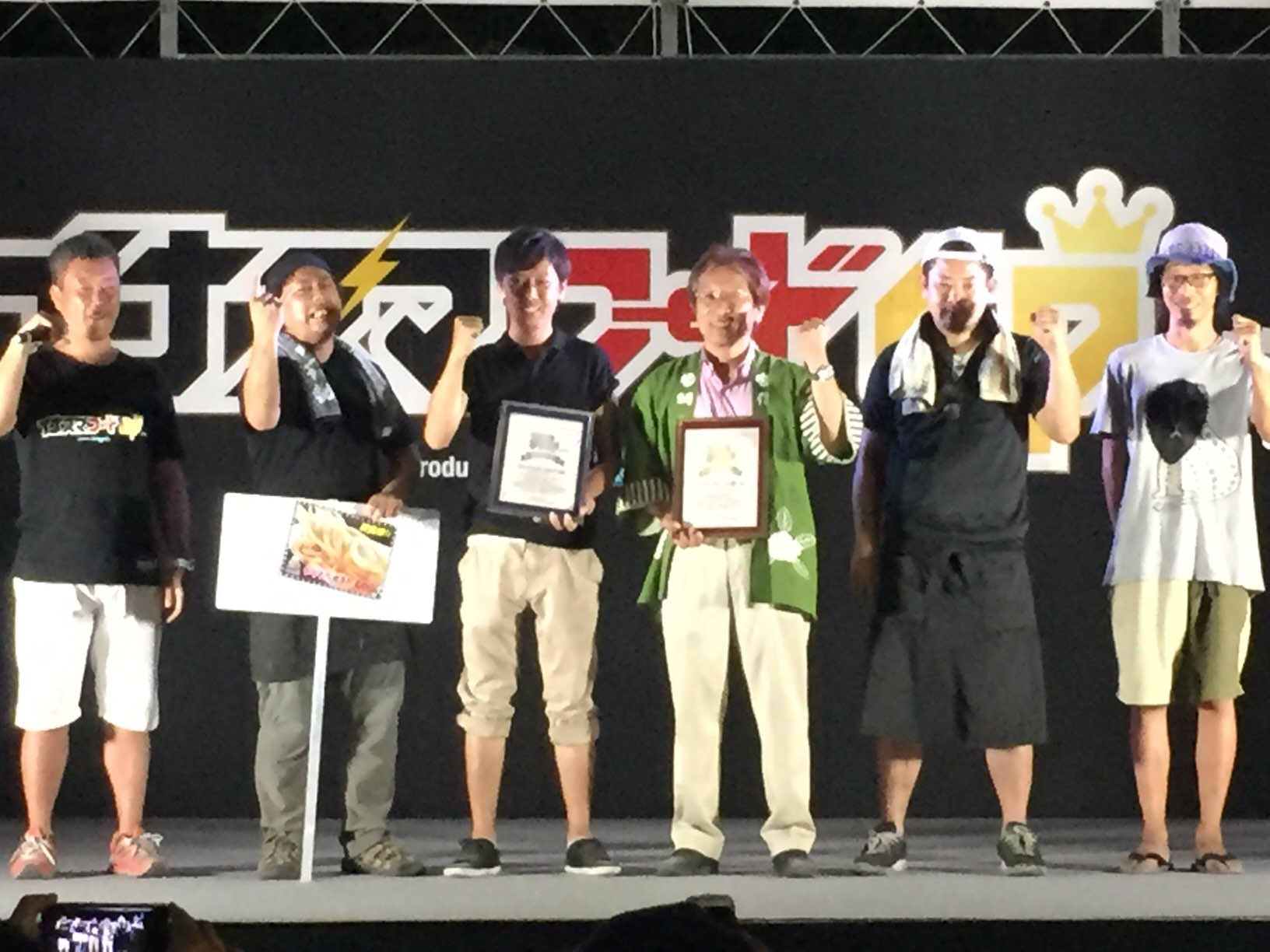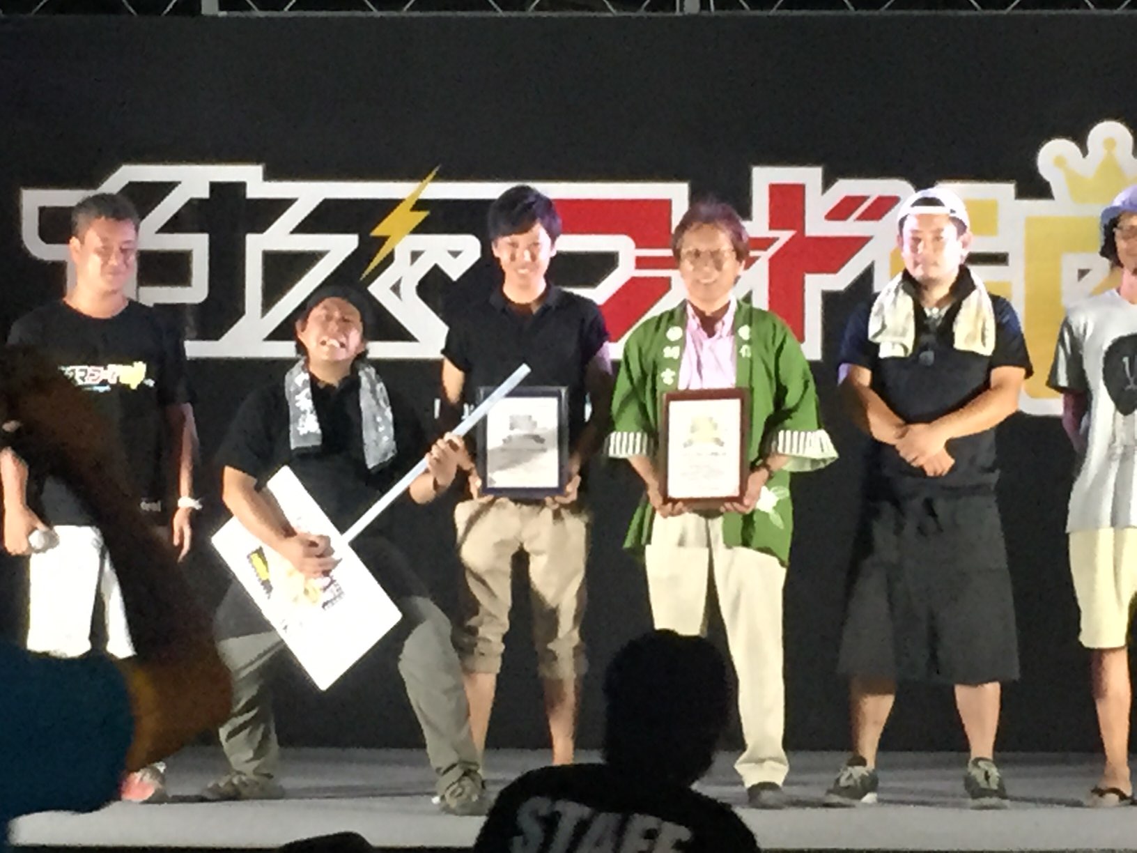 表彰台では、今回もちもちポテト・弥平ギャー油マヨの考案者の齋藤氏がエアギターを持ってステージへ…。