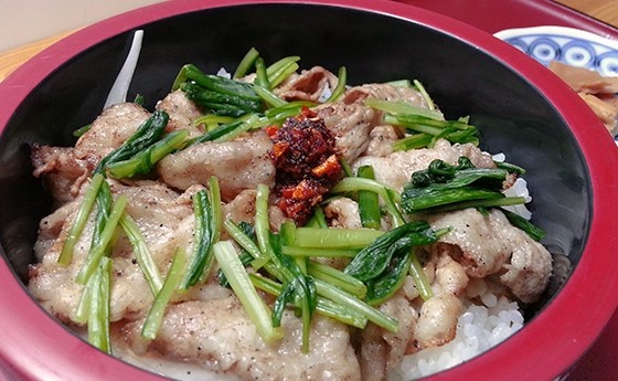 ゆる辛丼とは白米の上に歯ごたえの良い新鮮なオニオンスライスの上にほんのりガラムマサラの効いた豚バラの上は京野菜の壬生菜の浅漬けをパラパラと。真ん中に少しパンチの効いたラー油を少々置いて一度食べるとクセになりそうな、さっぱりした特製タレで戴きます。向日市の特産たけのこの佃煮を添えて…